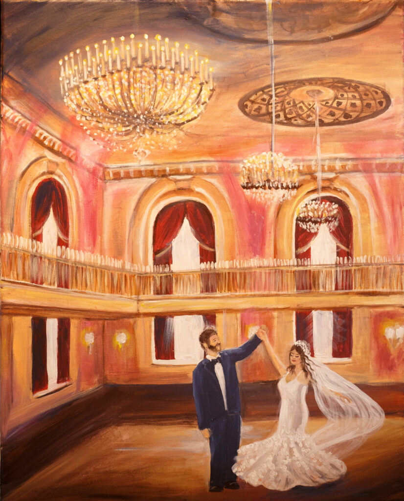 Each live wedding painting is created on site during your celebration and includes the bride and groom as the central subjects.